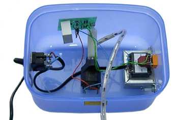 | A toggle switch rated at 250 volts was used as the on/off control. A biassed (spring-loaded) switch was used in the prototype and a waterproof cover was added to give extra insulation. | ![]() |