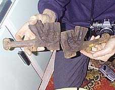 | The unearthing of the moulds! Mary thought they were of little or no value but had kept them covered with old sheets, bags, magazines and anything she could find. There were nearly 60 moulds and only two were badly damaged. We also found parts of the presses and even a stem scraper tool in useable condition. |