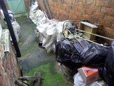 | In 2000 we found the yard looking like this. Mary was almost 80 and had accumulated rubbish over forty years. Note the gin presses at bottom left of the picture. |